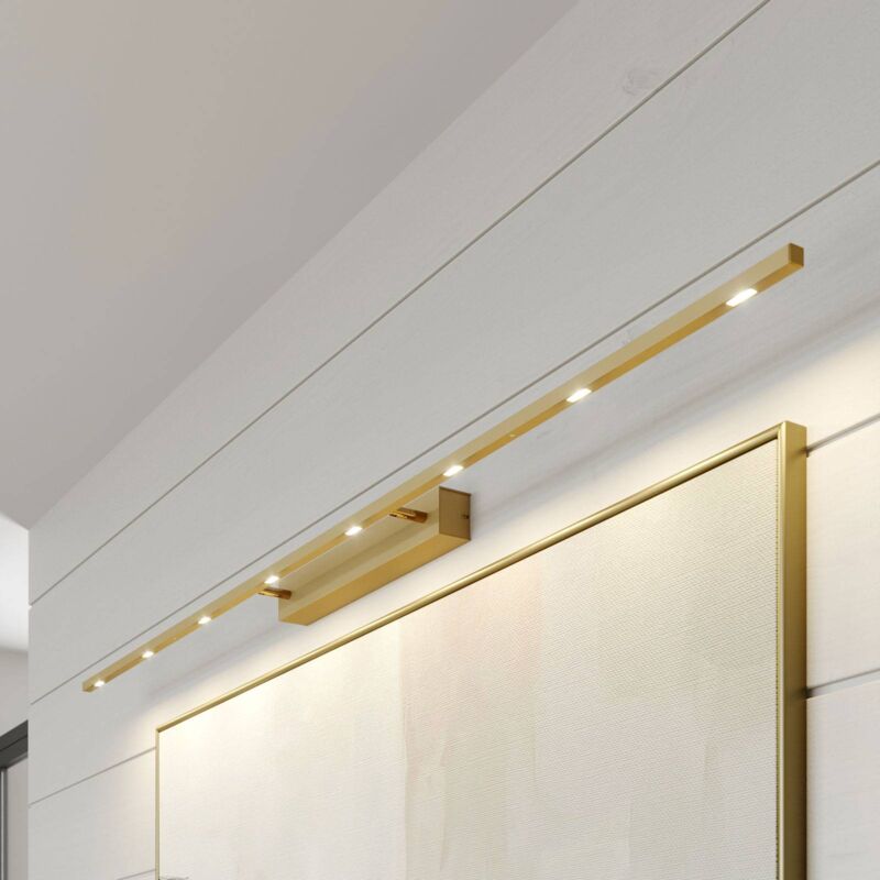 Delicata lampada LED per quadri Tolu, finitura in color ottone e barra luminosa inclinabile - qualità made in Germany Questa lampada per quadri presenta un'estetica molto moderna e ridotta. La finitura in color ottone aggiunge un tocco classico. La luce si concentra in basso, anche se la barra luminosa si può inclinare di 85° in modo da perfezionare la messa in scena. Non importa che si tratti del quadro preferito o di un disegno, di una stampa artistica o della foto di una persona cara: la lampada LED Tolu è perfetta per valorizzare ogni oggetto appeso alla parete. L'interruttore è inserito direttamente nel supporto, in modo da accedere e spegnere la lampada comodamente. La superficie della lampada è rifinita in color ottone lavorato a mano. Tolu è una lampada prodotta in Germania con i massimi standard qualitativi. Inoltre la lampada possiede un vano di raccordo spazioso dove trovano posto tutti i cavi. Colore: Materiale: alluminio, acciaio Colore della luce: bianco caldo (2.700 K)