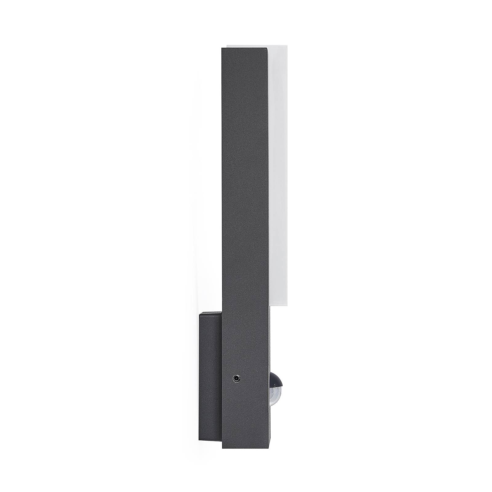 Apparecchio LED da parete per esterni Virgalia con sensore incorporato L'apparecchio LED da parete per esterni Virgalia si distingue per il suo design moderno e distintivo, che appare molto lineare e chiaramente strutturato. L'alloggiamento rettangolare è realizzato in alluminio con finitura superficiale grigio grafite. La copertura del paralume in plastica, invece, è stata progettata in un bianco opalino a contrasto. Le caratteristiche speciali di questo apparecchio sono il rilevatore di movimento e il sensore crepuscolare integrati. I movimenti possono essere rilevati a un angolo di 120° e a una distanza da 6 a un massimo di 10 metri. La durata dell'illuminazione può essere impostata individualmente dall'utente. Un oggetto di illuminazione molto pratico per l'ingresso e la terrazza! Questo apparecchio speciale colpisce per il suo aspetto elegante e per il design ridotto ai minimi dettagli. L'apparecchio LED da parete per esterni Virgalia è un arricchimento per le aree esterne dal design moderno. La combinazione di due colori contrastanti, ovvero la finitura grigio grafite dell'alloggiamento in alluminio e il bianco opalino del paralume, ha un effetto contrastante ma molto elegante. Il paralume è realizzato in plastica resistente, che funge anche da diffusore e permette alla luce di irradiarsi uniformemente nell'ambiente circostante. La tecnologia LED a risparmio energetico è installata in modo permanente e offre una piacevole luce bianca calda molto invitante. Grazie al grado di protezione IP54, questo apparecchio è adatto all'uso nell'ingresso o nella terrazza.