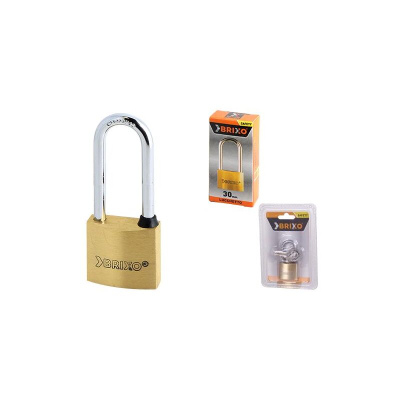 Lucchetti Brixo rettangolari arco lungo Corpo in ottone, con arco in acciaio temperato nichelato, doppia chiusura, due chiavi in dotazione, confezionati in scatola singola. Chiavi duplicabili con: UL060 per 30 mm. e 40 mm. - UL050 per 50 mm. Larghezza 40 mm. - Conf. Blister