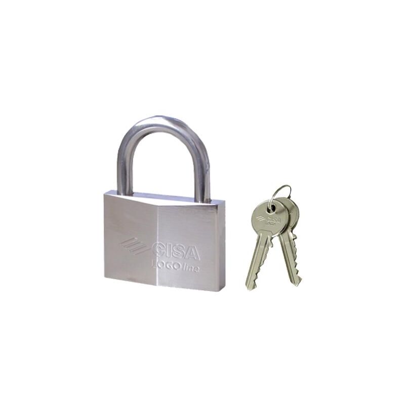 Lucchetti Cisa Locking Line inox Art. 21710 Corpo monoblocco in ottone cromato, arco normale in acciaio inox, doppio sistema di bloccaggio dell'arco. In dotazione 2 chiavi Larghezza 30 mm.
