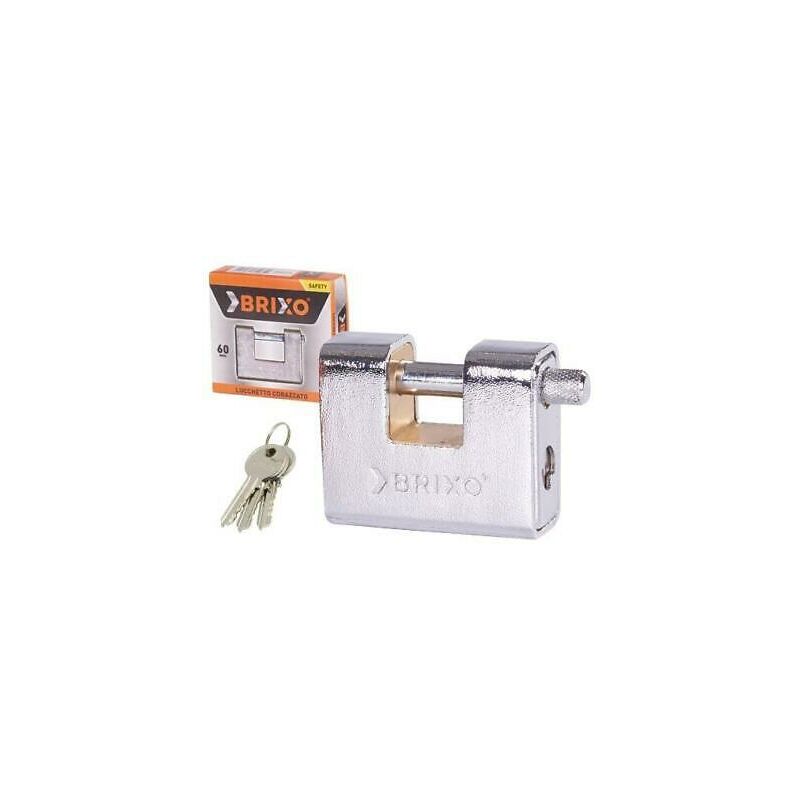 LUCCHETTI CORAZZATI ANTISCASSO BRIXO TOP IN OTTONE E ACCIAIO Corpo in ottone massiccio rivestito in acciaio nichelato antiscasso, asta in acciaio nichelato cementata, mostrina antistrappo in acciaio, con tre chiavi in dotazione MISURE DISPONIBILI: 271065 Larghezza mm. 60 - chiave CS 119 271066 Larghezza mm. 70 - chiave WA 1 6 271067 Larghezza mm. 80 - chiave WA 1 6 271068 Larghezza mm. 90 - chiave UL 050