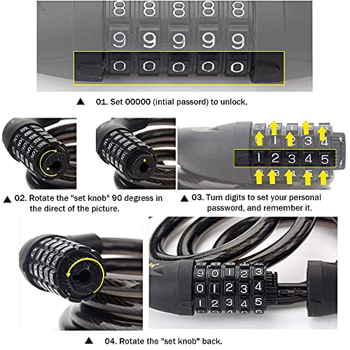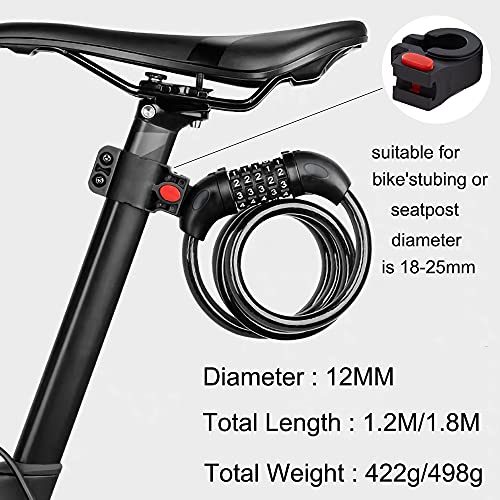 Lucchetto per Bicicletta, Lucchetto Bici -Lucchetto a Spirale Combinazione Ripristinabile 1.2m/12mm AntiTaglio Antifurto Bike Lock con Codice a 5 Cifre per Motociclette Scooter Gates Bicicletta