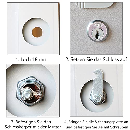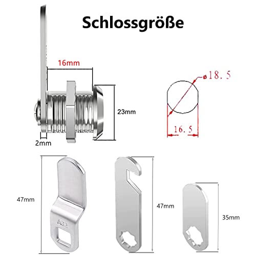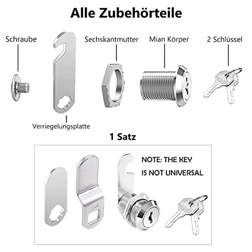 Set di serrature per mobili: il set include 1 serratura, 2 chiavi e 3 diverse specifiche di piastre di serratura. Il corpo del lucchetto ha un diametro di 18 mm, una lunghezza del cilindro di 16 mm e può essere montato su materiali fino a uno spessore di 12 mm. Tutte le serrature sono diverse e possono essere aperte solo con le due chiavi in dotazione.