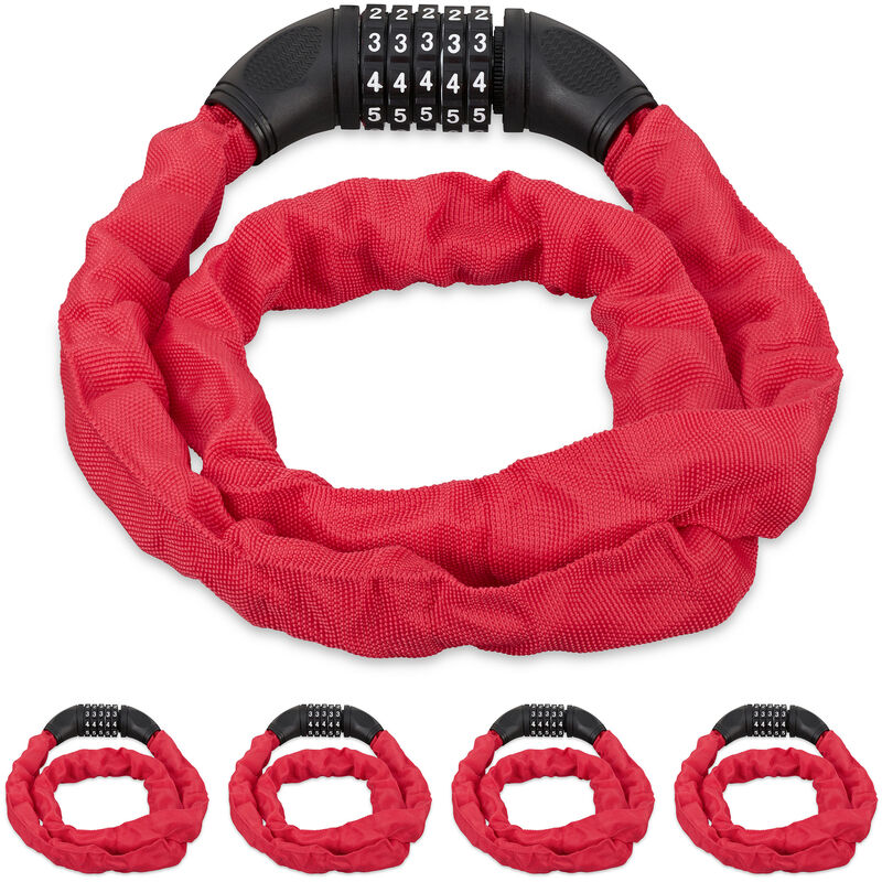 Questa catena con lucchetto a combinazione è un'ottima soluzione per proteggere la tua bicicletta dai ladri. Il catenaccio può essere utilizzato sia dagli adulti sia dai bambini. Il lucchetto si blocca e si sblocca facilmente con un codice numerico a 5 cifre, in modo da non dover portare con sé una chiave. Inoltre, la catena è molto lunga e può essere usata per chiudere più biciclette l'una con l'altra: perfetto per le famiglie! Set da 5 lucchetti a combinazione in dettaglio - Lunghezza da aperto: 120 cm ca. - Diametro catena: 2,2 cm ca. - Peso: 0,85 kg ca. - Materiale: acciaio, tessuto in PP - Colore: rosso Catenaccio per bici e altro - Per mettere al sicuro biciclette, motorini e passeggini - Sicura combinazione a 5 cifre - Massiccia catena in acciaio con rivestimento in tessuto - Mai più fastidiose ricerche delle chiavi - Perfetto in viaggio o per ogni giorno Contenuto della spedizione - 5x lucchetto a combinazione - Istruzioni - Articoli decorativi non inclusi nel contenuto della