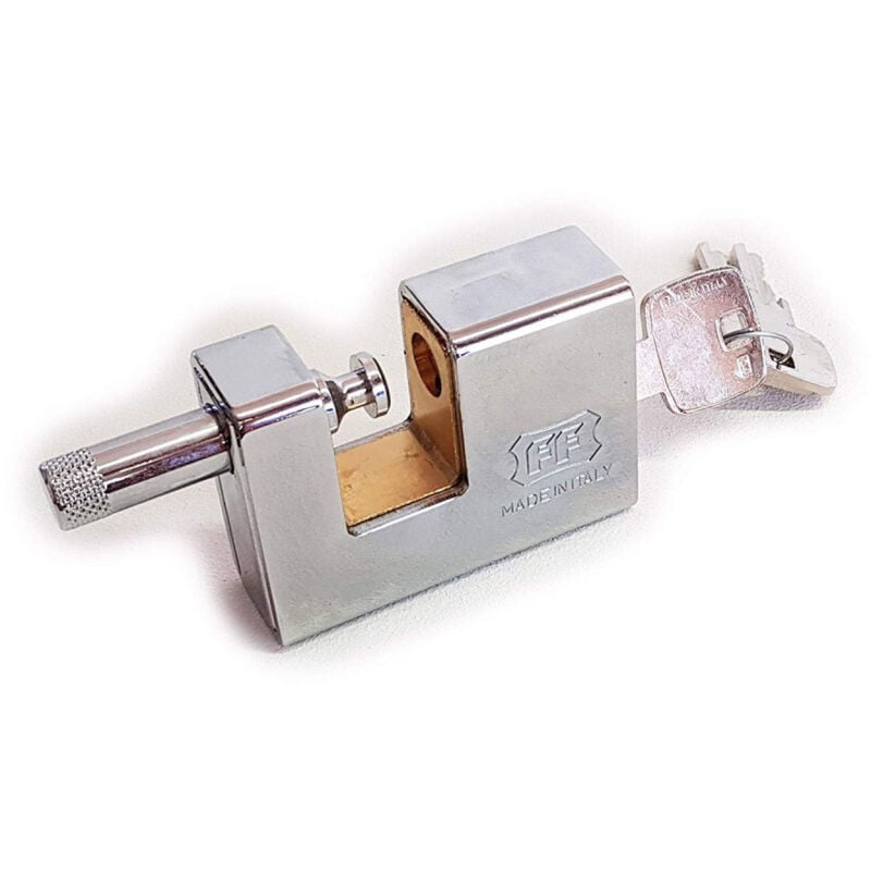 3 chiavi in dotazione Lucchetto da serranda rivestito con corazza da 3 mm In acciaio carbonitrurato temprato e cromato su corpo in ottone Barra di chiusura in acciaio carbonitrurato, temprato e cromato con apertura automatica a molla Doppia chiusura Meccanismo di chiusura a 5 pistoncini ( primo antitrapano e 2 antimanipolazione) Molle in acciaio inox Profilo chiave paracentrico Chiave estraibile solo a lucchetto chiuso Fornito in scatola singola con 3 chiavi in ottone nichelato