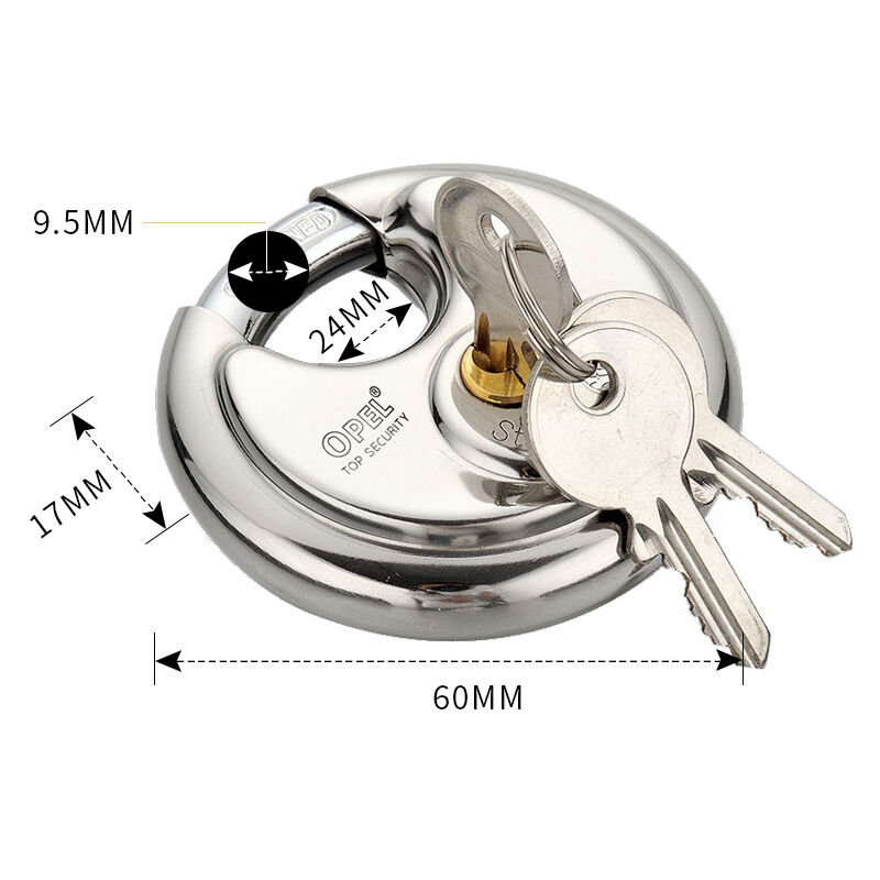 Peso: 0,5 kg Taglia: 60*60*17 mm Colore: come mostrato Alta sicurezza: il design rotondo e schermato riduce al minimo l'esposizione del grillo e protegge dagli attacchi dei tronchesi. La struttura in acciaio inossidabile con cilindro in ottone offre una maggiore sicurezza. DUREVOLE E RESISTENTE ALLE INTEMPERIE - Il nostro lucchetto a disco è realizzato in acciaio inossidabile 304, resistente alla ruggine e alla corrosione, è resistente a tutti i tipi di agenti atmosferici. E' dotato di 3 chiavi per evitare problemi con chiavi rotte o smarrite. Il lucchetto è facile da bloccare e sbloccare. Specifiche - La dimensione del corpo del lucchetto, inclusa la guaina in gomma, è 60*60*17 mm, grillo di 9,5 mm di diametro. Il tampone in gomma può evitare graffi inutili e prolungare la vita del lucchetto. Versatile: il lucchetto è adatto per uso interno ed esterno. Ideale anche per magazzini, armadietti, garage, capannoni, cancelli, magazzini, porte ecc.