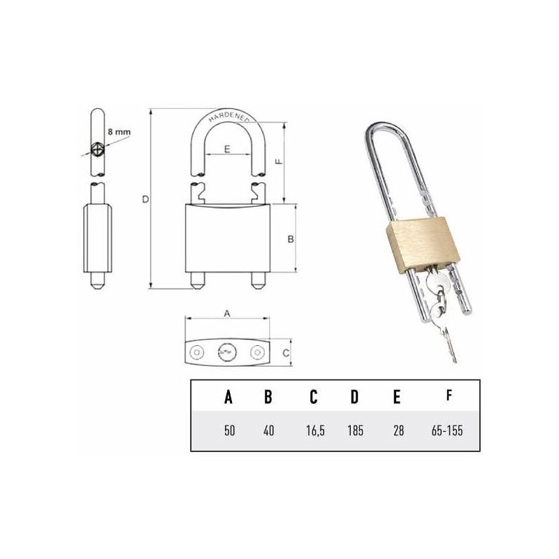 Corpo Monoblocco Ottone Smerigliato Arco Lungo Acciaio Carbonitrurato Nichelato Altezza Arco Regolabile Mm 65/155 Doppio Sistema Di Bloccaggio Arco 2Chiavi