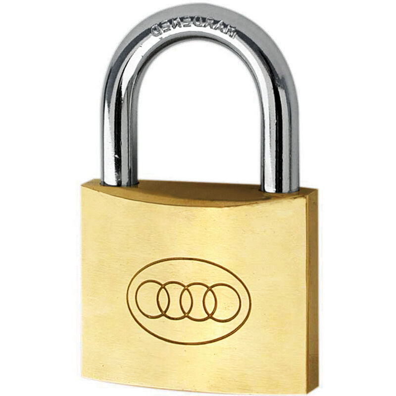 Lucchetto in acciaio finitura ottone. Modello rinforzato, manico cementato. Consegnato con 3 chiavi. Lunghezza: 25 mm Ø Grillo / altezza: 4 mm / 15 mm