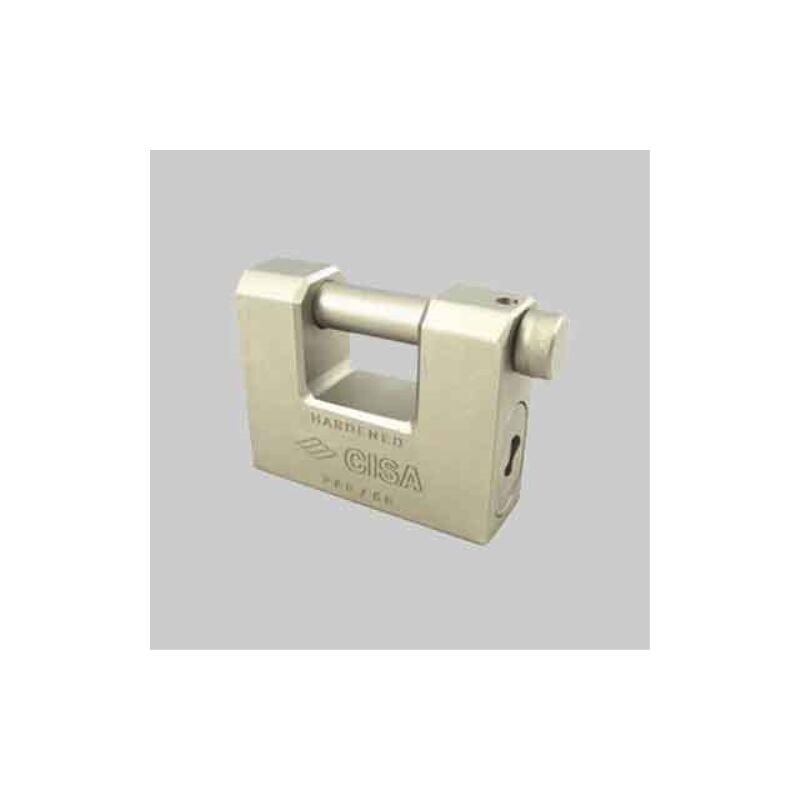 Corpo monoblocco in acciaio carbonitrurato con trattamento anticorrosivo di nichelatura chimica. Arco in acciaio cementato con trattamento di nichelatura chimica. Cilindro sostituibile e ricifrabile. Piastrino di protezione cilindretto in acciaio carbonitrurato con trattamento di nichelatura chimica. In dotazione due chiavi con profilo Lim. Lucchetto rettangolare in acciaio con chiave lim cisa 75 mm CISA Serrature cisa