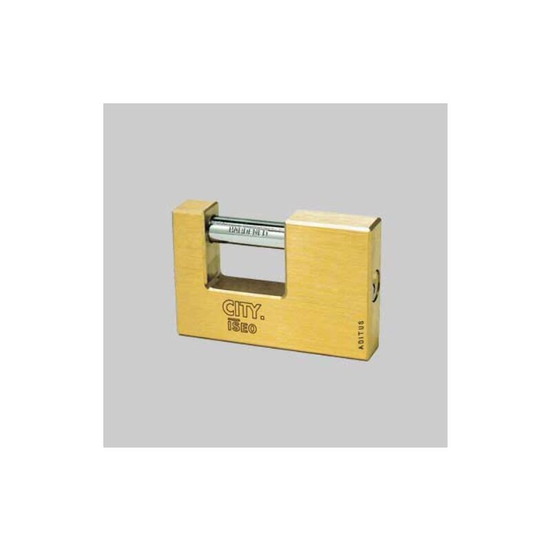 Corpo in ottone satinato e verniciato. Stelo in acciaio carbonitrurato e cromato. Bloccaggio stelo con sfera. In dotazione 3 chiavi. Lucchetto rettangolare per serranda 'aditus' iseo 90 mm ISEO Serrature iseo