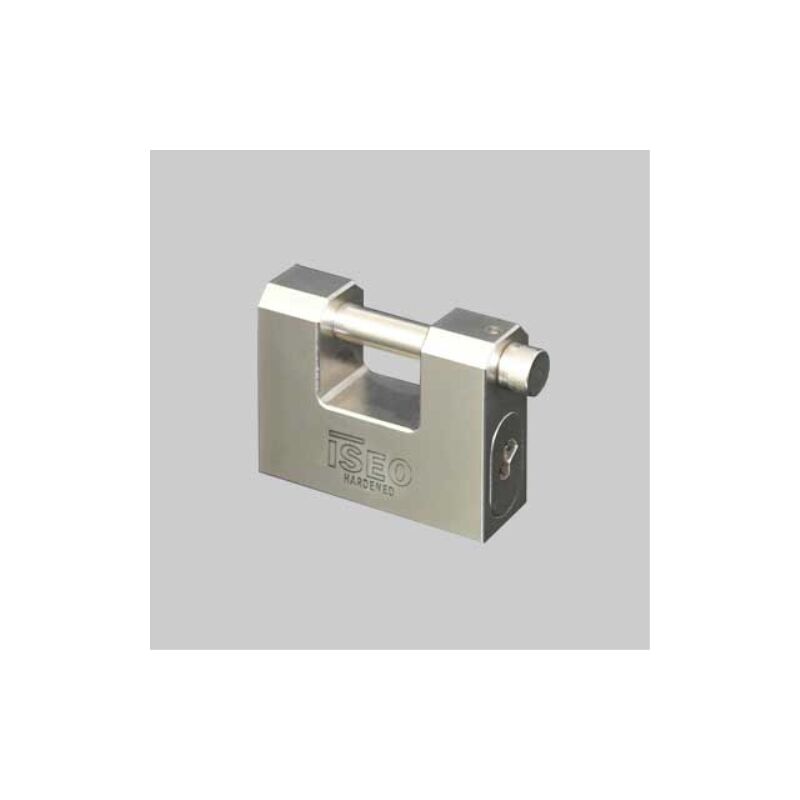 Corpo monoblocco in acciaio carbonitrurato. Stelo in acciaio cementato. Bloccaggio stelo con sfera. In dotazione 3 chiavi. Lucchetto rettangolare per serranda 'clarus' iseo 84 mm ISEO Serrature iseo