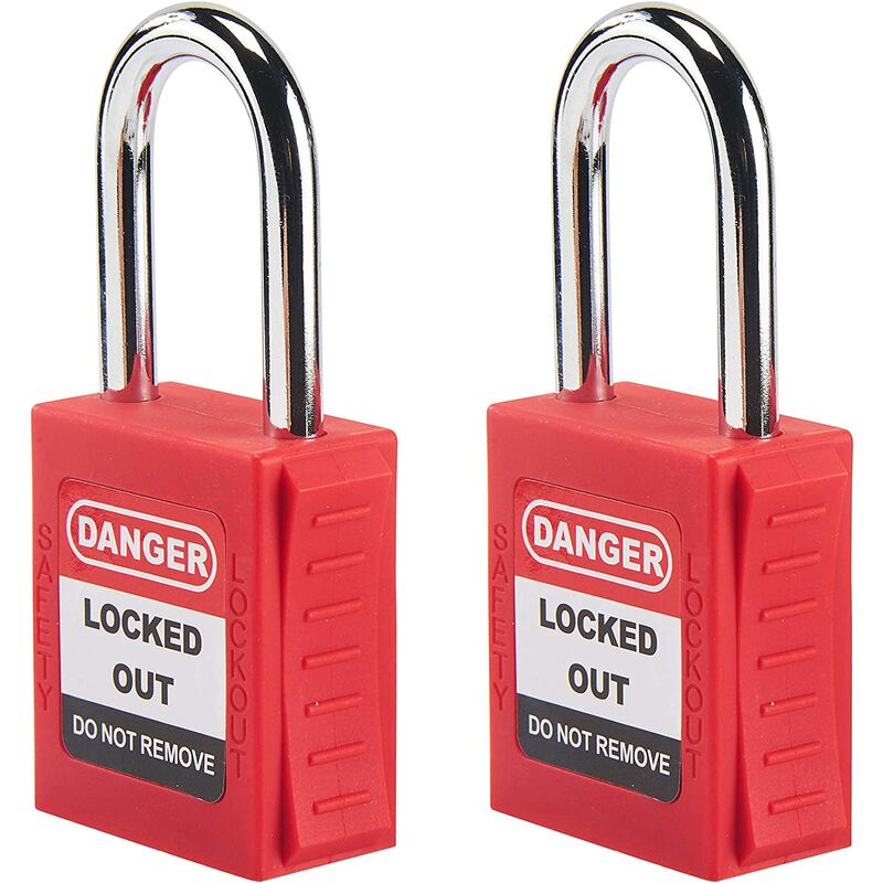 Lunghezza del grillo: 1-1/2 pollici (3,8 cm). Inclusa l'etichetta PERICOLO: bloccato, non rimuovere. Qtà - 2 pezzi, ogni lucchetto di sicurezza ha un chiave diversa.