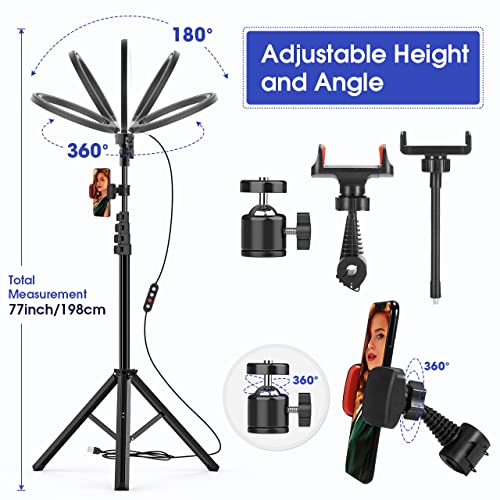 Luce ad anello girevole a 360°: luce ad anello a LED girevole a 360° con supporto, è possibile regolare l'angolo di 45°, 90° o 180° in base alle proprie esigenze. Grazie al morsetto del telefono girevole a 360°, il telefono supporta le riprese video verticali o orizzontali, il morsetto del telefono regolabile da 5,5 a 8,5 cm è adatto per iPhone 11/11 Pro/XS Max/XS/XR/X/8/8+/7/7+ /6, Samsung S10/S10+/S9/S9+, Huawei, ecc.