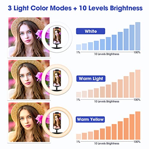 Luce ad anello con treppiedi, 10,2 pollici LED per selfie con 3 colori e 10 livelli di luminosità, telecomando e supporto per cellulare per trucchi, streaming, YouTube, Tiktok, Vlog e fotografia