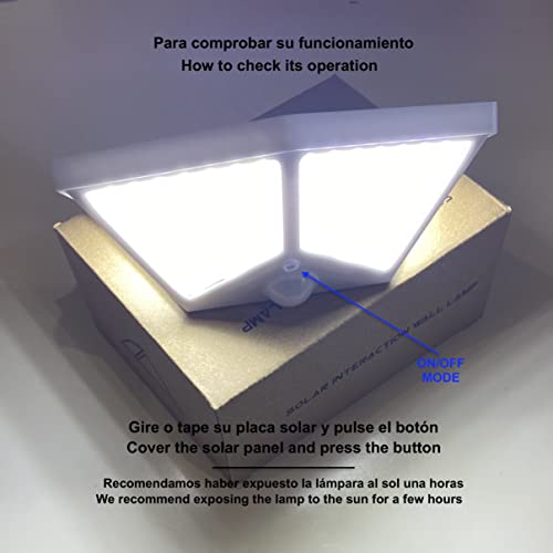 Tre modalità selezionabili premendo il pulsante. Il sensore PIR di movimento attiverà la lampada. 3 modalità: modalità sensore movimento illuminazione totale luminosa. Modalità luce soffusa cortesia con rilevamento del movimento che attiva la massima luminosità durante il rilevamento del movimento. Modalità di accensione media permanente per tutta la durata della ricarica, tra 4 e 6 ore. Mentre la piastra solare integrata rileva una fonte di luce, se questa sia, la lampada non si accende.