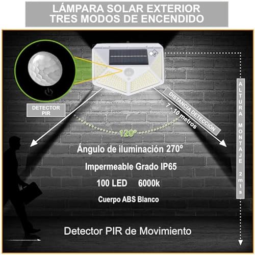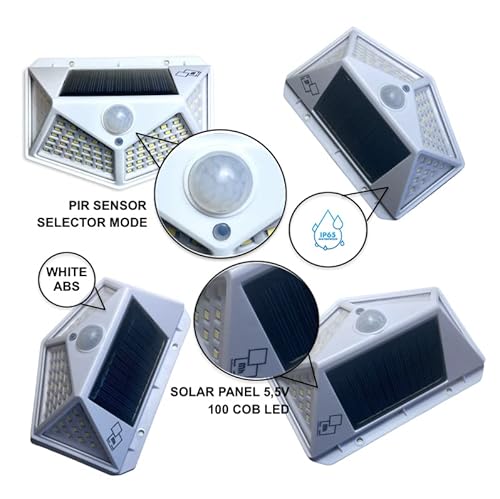 Luce solare esterna 6000 K, 1000 lm, con sensore di movimento tre modalità. Corpo ABS bianco. Batteria 2200 mAh. Resistente agli agenti atmosferici, grado IP65. Materiale ABS bianco.