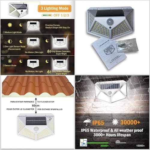 Facile da installare. Per una carica efficiente della batteria al primo utilizzo, è conveniente che la lampada sia sotto la luce diretta del sole 8 ore. Installare la lampada in luogo soleggiato sotto l'azione diretta del sole. . Se si installa la lampada sotto una tettoia o grondaia, lasciare una distanza di 60 cm in modo che il riflesso della sua potente illuminazione non influisca sul sensore della piastra solare ed evitare sfarfallio. Per controllare il funzionamento, coprire la piastra solare con la mano e premere il pulsante delle modalità.