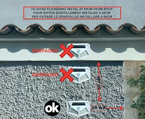 Per evitare lo sfarfallio è molto importante posizionare la lampada a una distanza di 60 cm da tettoie, grondaie o angoli. Puoi vederlo nel video esplicativo di come evitare lo sfarfallio.