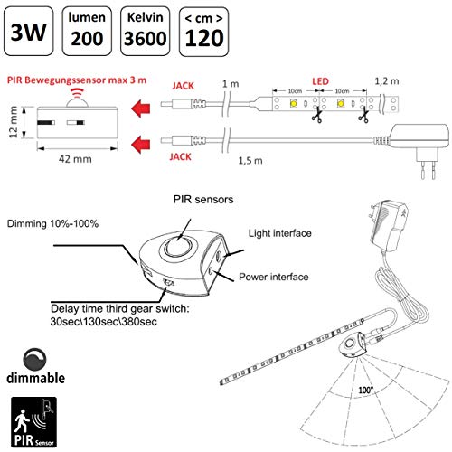Contenuto della confezione - Set di strisce luminose LED pronte per il collegamento: con fascia luminosa a LED 1,2 m, rilevatore di movimento integrato con funzione dimmer, alimentatore di rete per la presa, strisce adesive.
