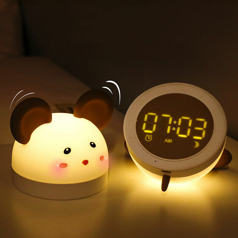 Sveglie luminose per bambini Adulti : Questa sveglia per bambini a forma di topo carino, con luce notturna per bambini, l'illuminazione soffusa accompagnerà te e il tuo bambino a dormire sonni tranquilli. L'orologio è semplice e comodo da leggere e visualizza automaticamente l'ora in piedi. Con la funzione snooze, prendi e metti giù la sveglia dopo che suona, la sveglia entrerà in modalità snooze di 5 minuti, premi il tasto sveglia per spegnere la sveglia. < p>Simpatica luce notturna della sveglia : 2 le modalità luce, luce calda e luce bianca possono essere commutate tramite il pulsante luce e la luce è morbida e non abbagliante.Ruota la coda del mouse per regolare l'ora e la luminosità della luce, luce notturna soffusa per proteggere gli occhi tuoi o dei tuoi bambini. Fornisci un ambiente di sonno di alta qualità per te e i tuoi figli ed è un buon compagno per gli studenti con cui studiare. Sveglia con ricarica USB : La luce notturna della sveglia per bambini viene caricata tramite