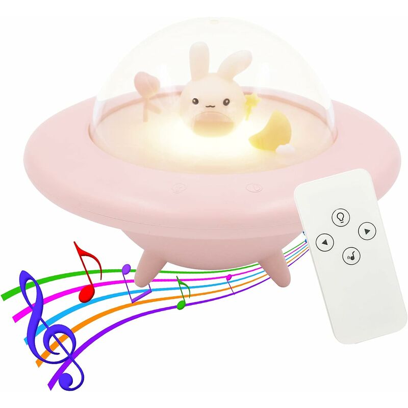 Sussidi per dormire ipnotici? Questo compagno perfetto per andare a dormire suona 5 dolci ninne nanne mentre emette una luce soffusa in 7 diversi colori rilassanti per calmare neonati e bambini irrequieti o aiutare con l'insonnia Arredamento carino per la camera da coniglio? Il coniglietto alieno nel disco volante è così carino, è un accessorio decorativo perfetto per la stanza delle ragazze, la stanza a tema coniglietto Luce notturna con telecomando? La distanza non è più un problema, puoi accendere questo ciuccio per bambini /off, scegli facilmente la luce e la luminosità tramite il telecomando senza alzarti dal letto o dal divano Luce notturna con timer di spegnimento Spegnimento automatico? La modalità luce gialla calda ha un timer di 45 minuti con spegnimento, risparmiando dal dover spegnere manualmente una volta che tu o tuo figlio vi siete sistemati in Lampada da comodino con regolazione continua?La funzione di int La densità continua delle modalità di luce calda ti consente
