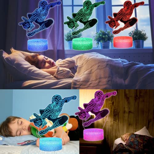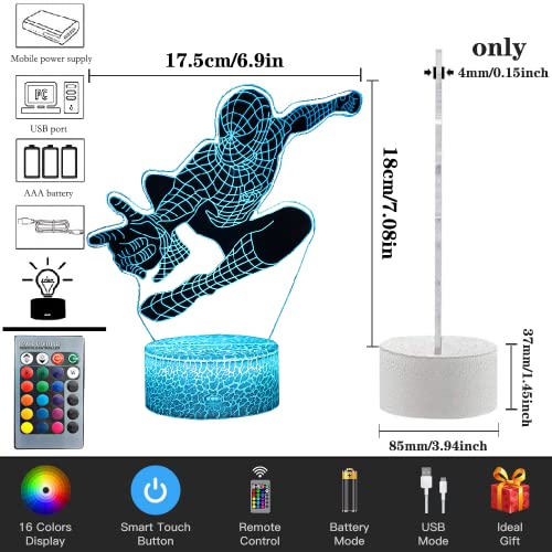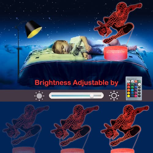 Luce notturna 3D con supereroe per bambini, giocattoli Spiderman per ragazzi, illusione 3D con telecomando che cambia 16 colori, lampada decorativa dimmerabile per la camera dei ragazzi, regalo di