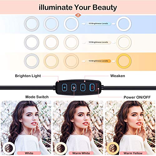 [3 colori, 10 opzioni di luminosità] La luce ad anello ha 3 modalità di luce colore: giallo caldo, bianco caldo e bianco. Ogni modalità di illuminazione può essere regolata su 10 diversi livelli di luminosità e la gamma di illuminazione può essere regolata dall'1% al 100%. La temperatura del colore può essere controllata e regolata da 3000k a 6000K. Apporta modifiche perfette all'illuminazione richiesta dalla tua occasione.