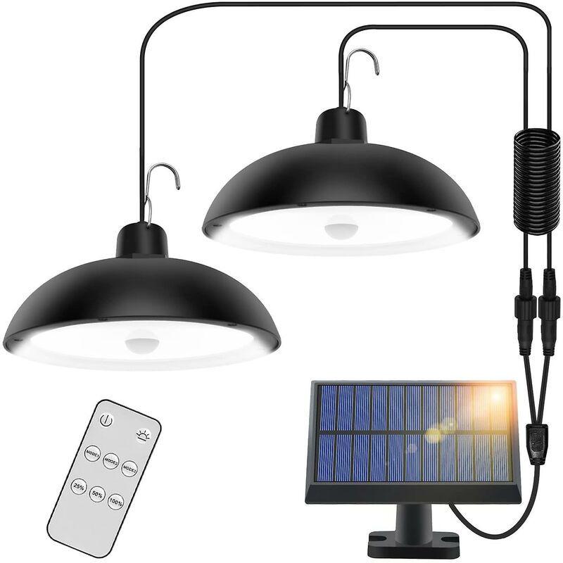 Aggiorna la lampada a doppia testa Il lampadario solare aggiornato è dotato di 2 luci indipendenti, un pannello solare e un telecomando. Puoi utilizzare il telecomando per accendere/spegnere 2 luci solari singolarmente o insieme, regolare la luminosità (25% /50%/100%) e impostare diverse modalità di illuminazione (Nota: il telecomando deve puntare verso la testa della lampada, la portata effettiva del telecomando: 3-5 m).Sensore di movimento avanzatoLa luce solare esterna ha 4 modalità di illuminazione: 1.) Modalità sensore: si illumina quando viene rilevato un movimento. 2.) Penombra + Sensore: la luce fioca (20%) passa a una luce intensa (100%) quando viene rilevato un movimento. 3.) Sensore di luce: la luce solare viene automaticamente carica durante il giorno e si accende automaticamente di notte 4.) Modalità sempre accesa: la luce è sempre accesa indipendentemente dal giorno o dalla notte Lampada a sospensione solare a risparmio energetico Il pannello solare è realizzato in