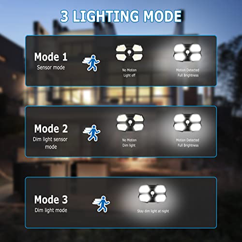 ☀ Modalità di sensore di movimento intelligente: le lampade solari con sensore di movimento hanno 3 modalità di funzionamento: ① Modalità luce forte ② Modalità sensore di luce forte ③ Modalità sensore di luce dimmerabile. Con sensore di movimento e sensore PIR, le luci solari possono riconoscere persone fino a 3-5 m con un angolo di 120°.