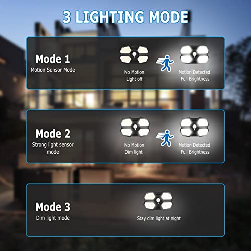 ☀Modalità Del Sensore Di Movimento PIR intelligente: Lluci solare sensore di movimento hanno 3 modalità di lavoro: ① Modalità luce forte ② Modalità sensore luci forti ③ Modalità sensore luce fioca. Con un rilevatore di movimento PIR, le luci solari possono rilevare persone fino a 10-16 piedi entro un angolo di 120 °.