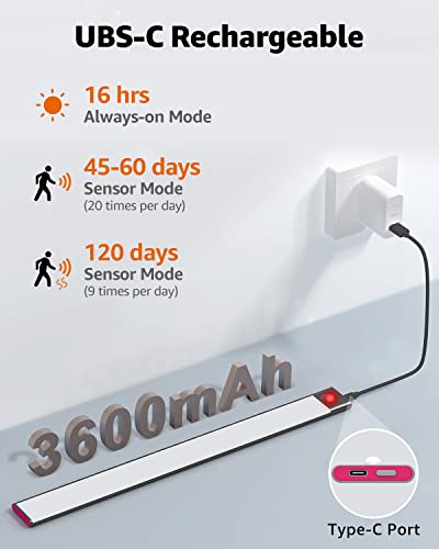 ✅ BATTERIA da 3600mAh & RICARICA USB-C: Nostre barra led sottopensile cucina ricaricabile utilizzano solo batteria al litio grado A, che hanno una maggiore densità di energia e una durata della batteria di livello mobile. La batteria da 3600mAh della luce led sottopensile senza fili magnetica può durare 4 mesi in modalità AUTO (6 volte al giorno) o fino a 16h di illuminazione costante. Luce scale con sensore di movimento sono dotate di una porta di ricarica USB-C per una ricarica.