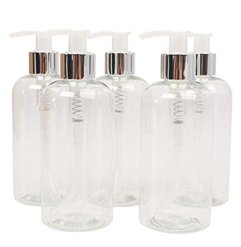 5 bottiglie vuote da 250 ml in plastica PET Boston trasparente con dispenser in argento cromato, per lozioni.