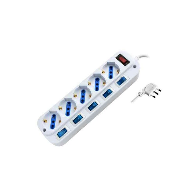 ES030 Multipresa Schuko Bipasso 5 posizioni, spina salvaspazio e 5 interruttori indipendenti.