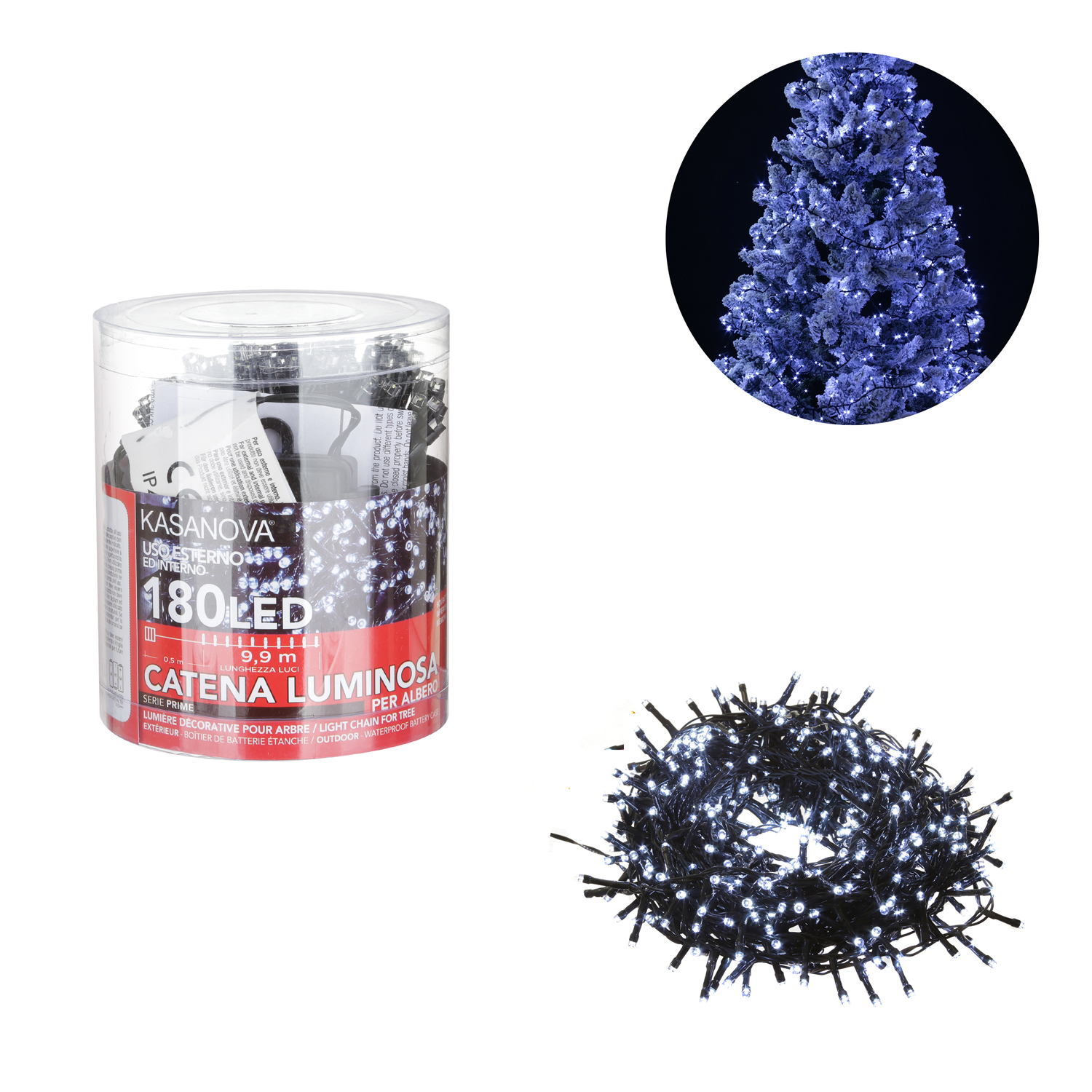 Crea una magica atmosfera con questa catena luminosa a luce bianca fredda, adatta sia per interno che per esterno. Il filo di luci è facile da posizionare sui rami del tuo albero di Natale e grazie al controller integrato puoi impostare e memorizzare 8 diversi giochi di luce per un effetto davvero suggestivo! Potrai utilizzare i 180 led anche per arricchire il tuo presepe e altre decorazioni sia in casa che sul balcone o in giardino. Le luci natalizie funzionano con batteria resistente all'acqua, con 3 pile AA non incluse. L'estensione della catena di luci copre 9,99 metri ed è composta da cavo verde di 0,5 metri. Confezionate in scatola trasparente per riporle in ordine alla fine delle festività.