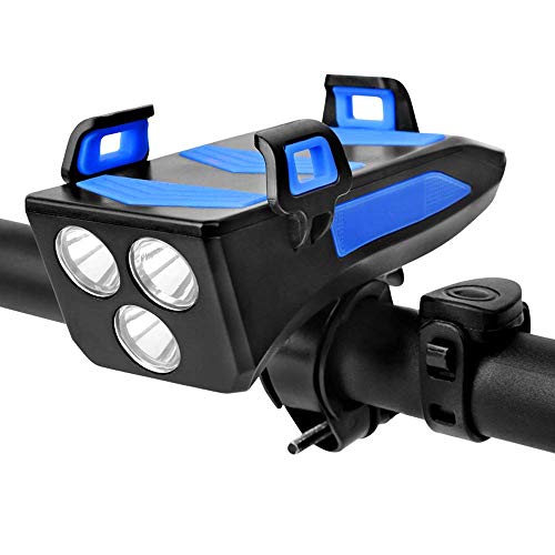 Luci Bicicletta LED, Ricaricabili USB 4 in1 Impermeabile Luce per Bicicletta con Clacson Bici & Porta Cellulare da Bici & 4000 mah Power Bank, Fanale Anteriore Bicicletta Facile Installazione (Blu)