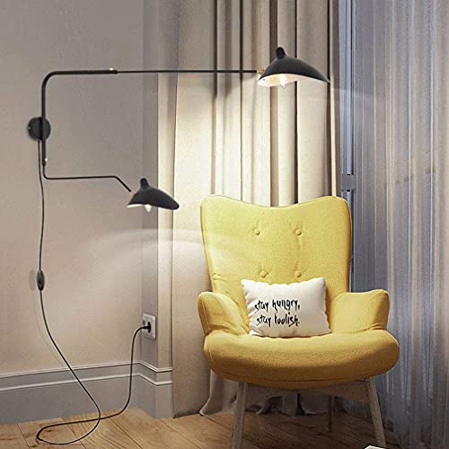 2 Luci Braccio Lungo Applique da Parete Interno con Interruttore E27 Lampada da Parete/Muro Vintage Industrial Metallo Creativo Orientabile Molte Direzioni Comodino Lampada da Lettura Nero 120-65cm