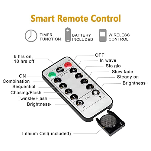 【8 modalità di illuminazione tramite telecomando】 - È possibile modificare le modalità tramite telecomando (Combinazione, In-wave, Sequenziale, Slo-Glo, Chasing/Flash, Slow Fade, Twinkle/Flash, Steady On). Ideale per ricevimenti di nozze, esposizione di biglietti di Natale, decorazioni per feste di fidanzamento, decorazioni romantiche per feste di San Valentino, feste di compleanno per ragazze di 11 o 13 anni.
