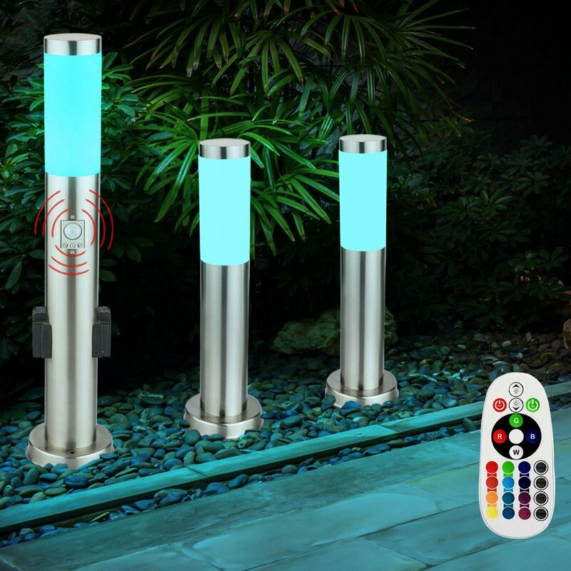 Descrizione Lampade da terra di design in acciaio inossidabile per il tuo spazio esterno. Con queste luci, ad esempio, il percorso attraverso il giardino può essere perfettamente messo in scena o alcuni oggetti nell'area esterna della tua casa possono essere magnificamente accentuati. Una delle tre luci ha 2 prese, ideali per collegare tosaerba o altre attrezzature elettriche da giardino. Inoltre, questa luce è dotata anche di un rilevatore di movimento, che è un vantaggio per la sicurezza della tua casa. Grazie alla classe di protezione IP44, le luci sono protette dagli spruzzi d'acqua e sono quindi predestinate per l'uso esterno. Utilizzando il telecomando in dotazione, l'illuminante LED RGB può essere impostato su diversi colori e garantisce così un'illuminazione d'atmosfera. Tre lampadine LED RGB con telecomando per luce bianca e controllo RGB sono incluse nella fornitura. La fornitura comprende una lampada da terra con rilevatore di movimento e prese e due lampade da terra con
