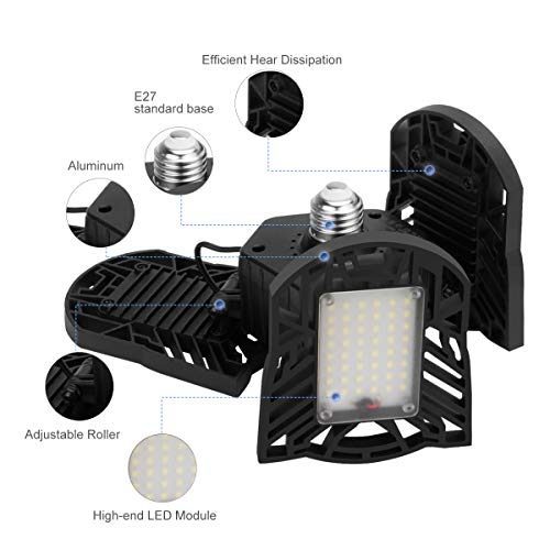 Super luminoso e ampia copertura: eroga fino a 6000lm a 6000K di luce bianca super luminosa, luminosità sufficiente per soddisfare tutte le vostre esigenze, copre un'area super ampia di 360 gradi, molto più luminosa delle tradizionali lampadine a incandescenza o fluorescenti, facile da raggiungere in tutti gli angoli del tuo garage / cantina / magazzino / negozio / cucina come di giorno. Rendi più semplice vedere tutto chiaramente e trovare le cose.