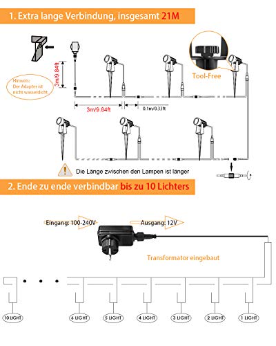 【Faretto led da Esterno a bassa tensione da 12 volt】 Le luci da giardino con picchetto da terra sono certificate CE e l'adattatore ha superato la certificazione GS. Solido e sicuro, questo era l'obiettivo nello sviluppo del set di luci da giardino. L'alloggiamento della lampada da giardino a LED è realizzato in alluminio pressofuso, il vetro temprato protegge i LED ad alta potenza all'interno della luce da giardino a LED. E funzionamento esterno sicuro fino a 12V.