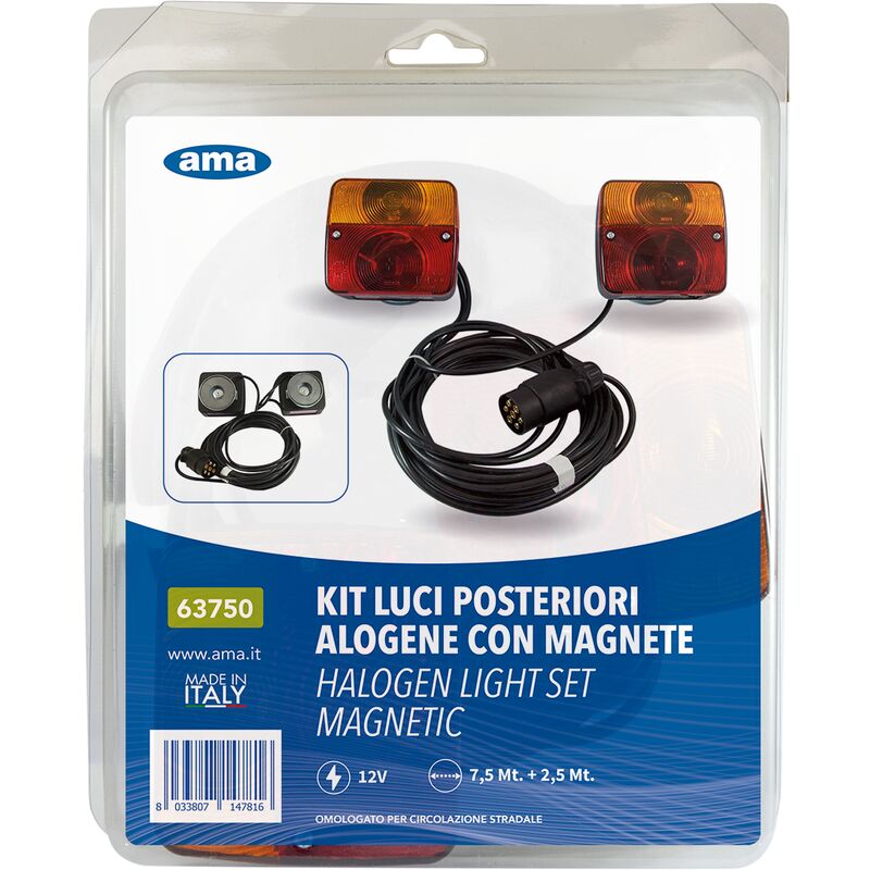 Il kit luci da 12V di Ama Imel è una soluzione completa per l'illuminazione del rimorchio. La confezione include cablaggi di lunghezza 7,5 m e 2,5 m con un sistema magnetico per una facile installazione, fanali posteriori, spina 7 poli e cavo 5 poli. Tutto il necessario per una corretta e sicura illuminazione. Il kit include anche le lampadine, così da essere subito pronto all'utilizzo . Questo kit è ideale per chi desidera aggiungere o sostituire le luci del proprio rimorchio, o per chi ha bisogno di una soluzione di emergenza in caso di guasto. Garantisce una perfetta visibilità durante la guida, in qualsiasi condizione di luce. Alimentazione Tensione nominale (V): 12 Dati principali Marca: Ama Tipo: Kit luci magnetico Dotazioni Cavo: lunghezza 7, 5 m + 2, 5 m tra fanali Funzionalità Tipo luce: alogena Informazioni d'uso Settori di applicazione: agricoltura Temperatura di esercizio: -20°C ~ +50°C Utilizzo: Rimorchi, macchine agricole