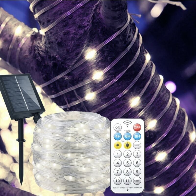 Luci di Natale catena da esterno 30 mt di 300 micro LED a ricarica Solare e USB luce Fredda cavo Trasparente Illuminazione Atmosferica Natalizia: Questa catena luminosa da esterno è perfetta per creare un'atmosfera natalizia magica. Con 300 LED una lunghezza di 30 metri, trasforma il tuo spazio esterno in un luogo accogliente per festeggiare le vacanze. Energia Solare e Ricarica USB: Grazie al pannello solare e alla batteria ricaricabile, questa catena luminosa si alimenta con energia solare durante il giorno e può anche essere ricaricata tramite USB per garantire l'illuminazione continua durante la notte. Controllo Facile con il Telecomando: Il telecomando incluso ti permette di accendere e spegnere le luci, regolarne la luminosità e impostare giochi o un timer di spegnimento a 4/6/8 ore. Scegli tra diverse modalità di intermittenza per un effetto luminoso personalizzato. Resistente e Adatta all'Esterno: Con una copertura in silicone e una classificazione IP65, questa catena luminosa
