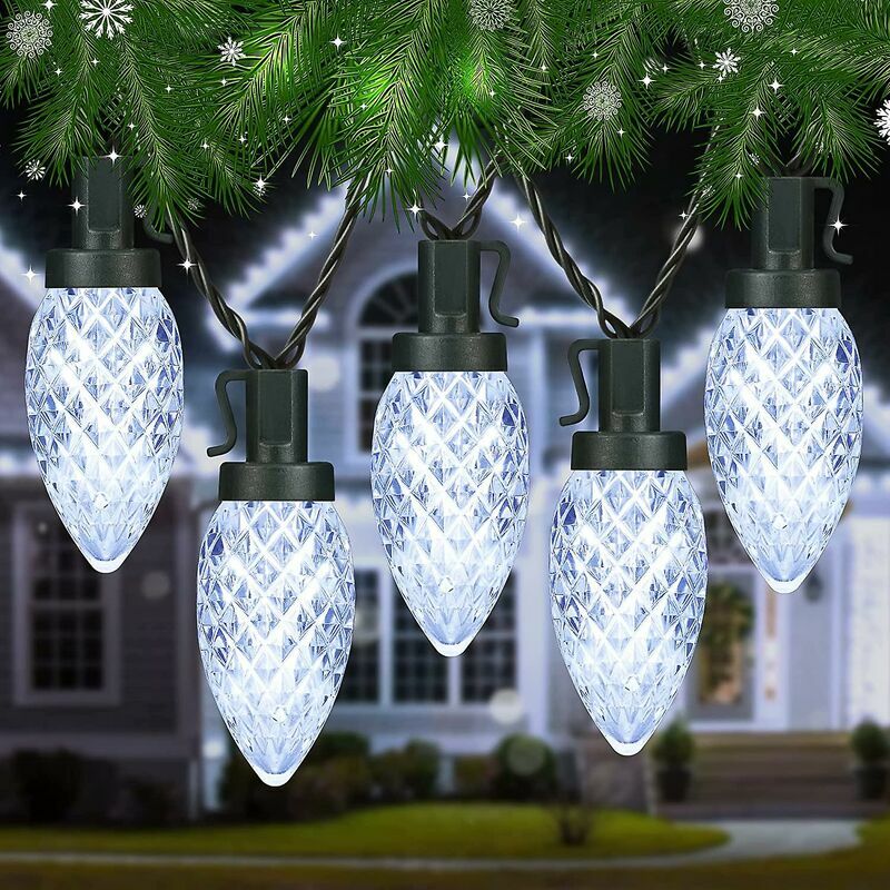 Luci decorative natalizie C9 - Le luci natalizie rosse e verdi da 33 piedi sono dotate di 50 lampadine C9 luminose. Le luci a filo verde sono adatte per la decorazione dell'albero di Natale. Le luci a stringa di fragola hanno un cavo super lungo da 16,4 piedi. Ideale per decorazioni interne ed esterne. Aggiungi una calda atmosfera festiva a casa tua. 8 modalità di illuminazione, timer e funzione di memoria: le luci scintillanti di Natale contengono una modalità fissa e 7 tipi di diverse modalità lampeggianti. che soddisfano le vostre diverse esigenze di decorazione. C'è un pulsante sull'adattatore. Premere brevemente per scegliere la modalità. Premere a lungo 3S fino a quando la luce verde è accesa, quindi il timer è attivato. Il chip di memoria salverà l'ultima impostazione della modalità e non è necessario reimpostare la modalità ogni volta. Collegabile end-to-end: ogni stringa luminosa C9 ha una spina di sicurezza maschio e femmina. La facile connessione end-to-end consente di