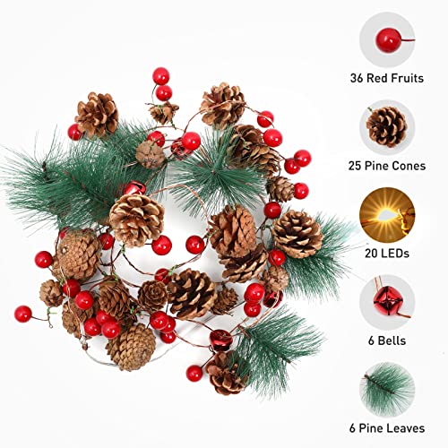 1. Questa catena luminosa a forma di pigna è lunga 180 cm (senza il vano batteria). pigne, aghi di abete, bacche, campanelle e 20 luci a LED a luce bianca calda creano un'atmosfera calda, allegra e festosa per il vostro inverno di Natale e rendono la vostra casa, le vostre feste e le vostre festività piene di gioia.