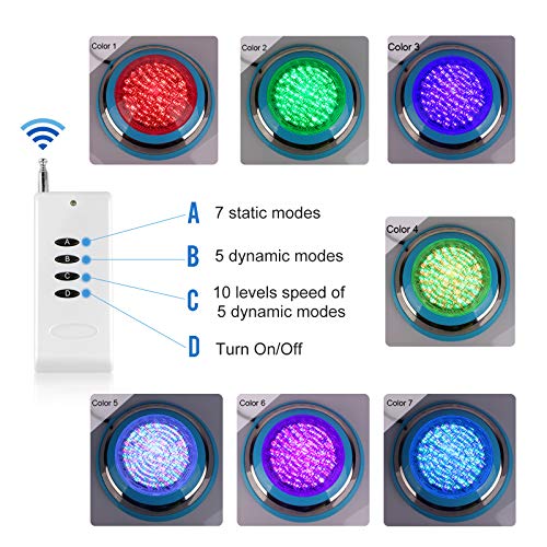 Rendi la tua piscina colorata: colori multipli e colori multipli. 7 modalità statiche, 5 modalità dinamiche, 10 livelli di velocità per 5 modalità dinamiche. È possibile scegliere qualsiasi modalità che si preferisce tramite telecomando, il faretto Roleadro Led per piscina rende la vostra vita più colorata.