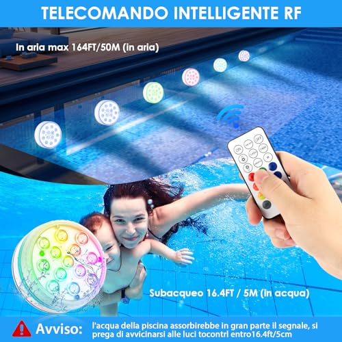 【Luci LED Completamente Impermeabili IP68】Struttura monoblocco impermeabile per piscine, completamente impermeabile, non è necessario sostituire la batteria. La distanza massima a lungo raggio è di 200 piedi (in aria), 10-17 piedi (sott'acqua), e può anche passare attraverso l'acqua e le pareti.