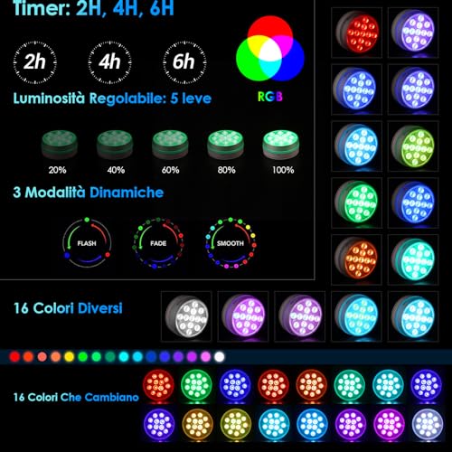【16 Luci per Piscina a LED con Cambio di Colore】Ogni luce ha 13 sfere LED luminose con un diametro di 8,5 cm, in grado di fornire una gamma di illuminazione più ampia. 3 modalità dinamiche: flash, smooth, fade e 16 colori statici RGB. 3 pulsanti di temporizzazione (2H, 4H, 6H), funzione di memoria e 5 livelli di luminosità regolabili. È possibile premere il pulsante per selezionare il colore in base alle diverse scene per creare un'atmosfera unica.