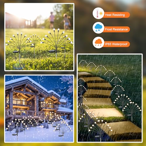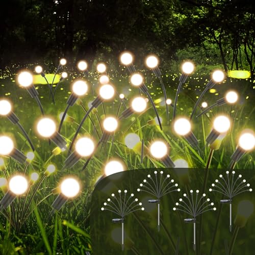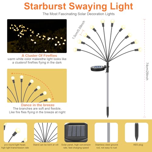 【Luci Solari da Giardino Aggiornate】 - Confezione da 4 luci da esterno giardino solari lucciole, ogni luce contiene 10 lampadine a LED all'estremità degli steli, ogni lampadina è supportata da fili molto morbidi e flessibili. Con il suo speciale design strutturale, le luci oscillano con il vento, imitando la danza delle lucciole nell'oscurità. È possibile utilizzare la lampade solari da giardino per il giardino in cortili, vialetti, cortili, passerelle, campeggi, compleanni, feste, Natale.