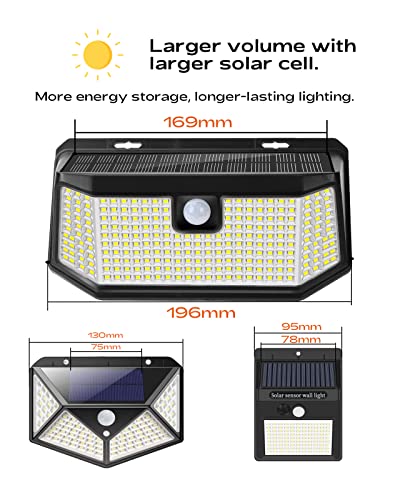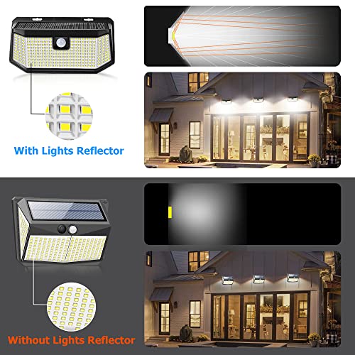 Super illuminazione: La lampada solare di Lepwings con sensore di movimento ha 238 LED, ognuno installato in un riflettore luminoso per ridurre la perdita di luce e aumentare l'efficienza luminosa. Ciò aumenta l'efficienza complessiva dell'illuminazione del 18%. Il raggio di illuminazione è di 270 gradi, offrendo una zona di illuminazione più ampia.