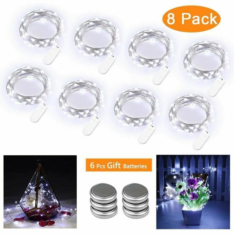 Ogni catena luminosa è alimentata da due batterie CR2032 sostituibili. Realizzate in filo di rame, le ghirlande luminose sono molto leggere, originali e delicate. La scatola della batteria è molto piccola per essere nascosta facilmente.Basso consumo, questa stringa di luci può illuminare per 48 ore e creare l'atmosfera romantica per te.La luce a LED, caratterizzata da meno luce ultravioletta e infrarossa, riduce gli effetti dannosi delle radiazioni sul corpo . Adatto per matrimoni, compleanni, Capodanno, Pasqua, barbecue, ricevimenti, eventi professionali, decorazioni per esterni. /> Specifiche Potenza: 1,8 W Voltaggio: 3 V Lunghezza totale: 8 x 3 m Tenuta: IP65. (Ma la scatola della batteria non è impermeabile) Ghirlanda Quantità: confezione da 8 unità Contenuto della confezione 8 ghirlande LED